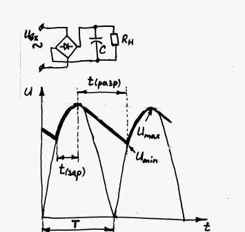 Находится емкость конденсатора, на которой за время t(раз) при токе нагрузки Iнагр напряжение с Umax уменьшится до Umin: